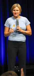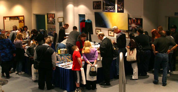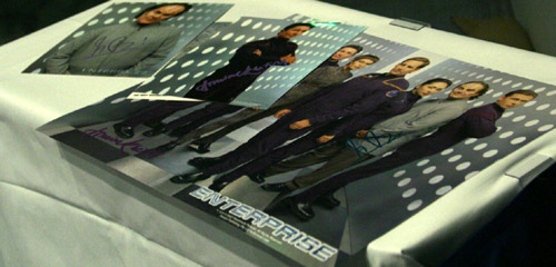 John Billingsley (Dr Phlox); Dominic Keating (Malcolm Reed); Denise Crosby (Tasha Yar) & lollipop. |